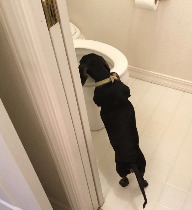 Strangest thing about that is he insists on jumping up on the toilet to look in, like there’s a pot of delicious treats or squeaky toys in there, just waiting for him. He’ll just wander in there on his own, just to look in. Maybe he thinks its a communication device to another world. Who knows what goes through the mind of a dachshund. I guess it’s a lot of crap.