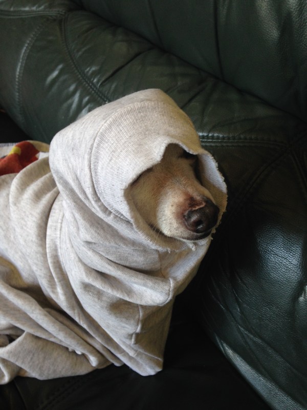 Her routine started with her typical dog spins to get a comfy place to sleep, but somehow she mistook my sweatshirt for a blanket or a tunnel. Next thing you know, she’s dug her way up through one of the sleeves until she just barely had her head popping out. She was quite comfortable, but didn’t have an easy time making graceful maneuvers. That just might get her disqualified.